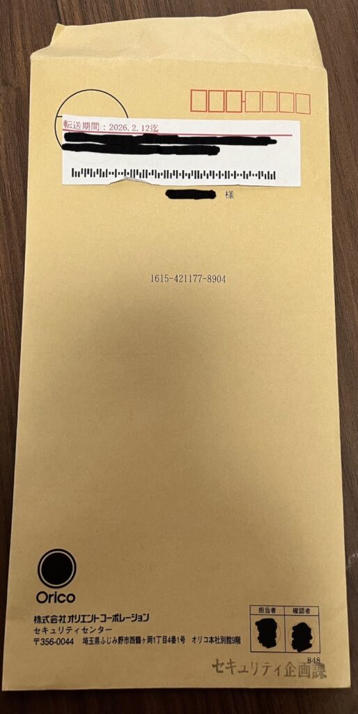 茶封筒に 「株式会社オリエントコーポレーション セキュリティセンター」 と記載があり、