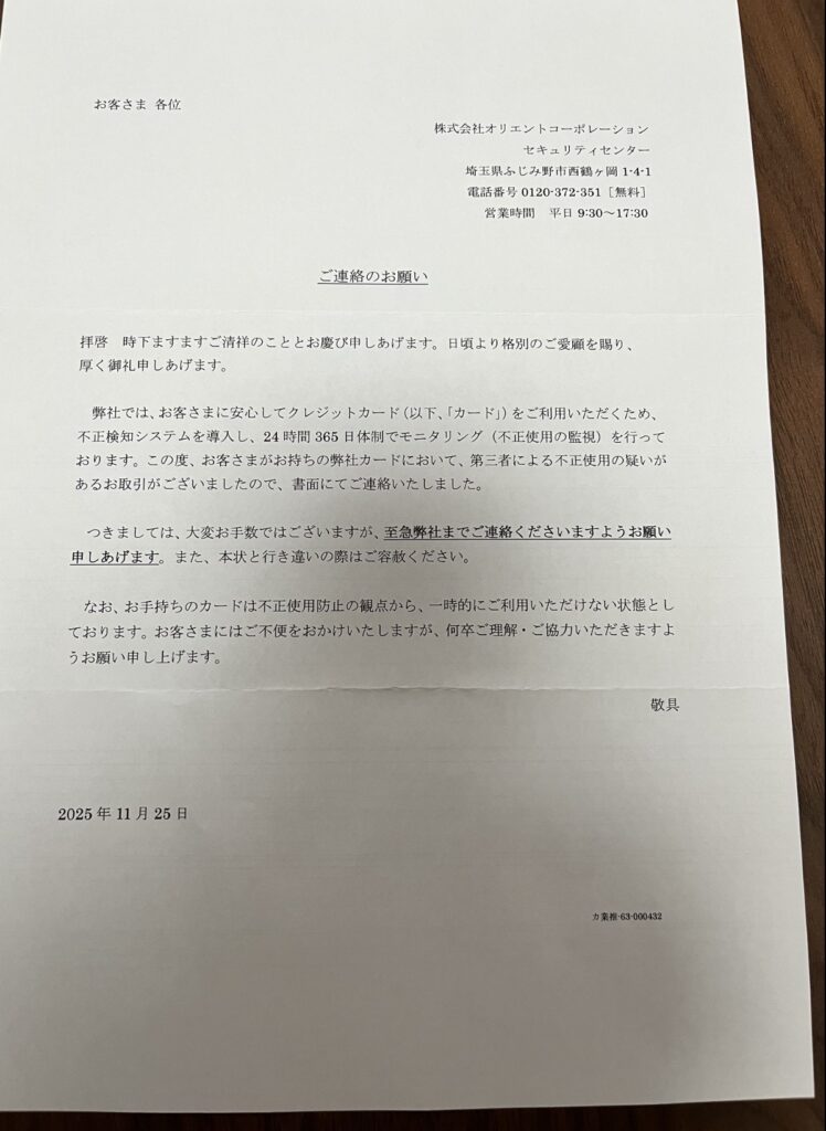 オリコ側が 事前にカードを止めてくれていた ので、本当に救われました。