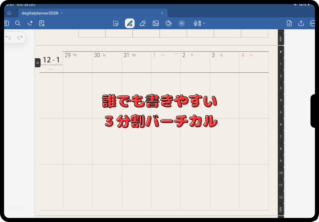 さらに、バーチカルページから他の週へもすぐに移動できるなど、